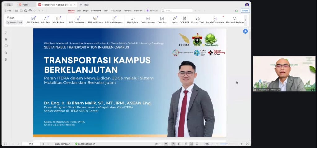 ITERA NEWS — Dosen Program Studi Perencanaan Wilayah dan Kota Institut Teknologi Sumatera (Itera), Dr. Eng. Ir. IB Ilham Malik, memaparkan konsep pengembangan transportasi kampus berkelanjutan dalam Webinar Nasional bertajuk “Sustainable Transportation in Green Campus”, Selasa, 31 Maret 2026.