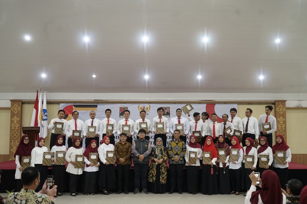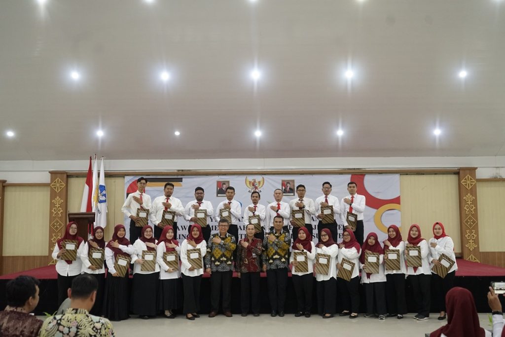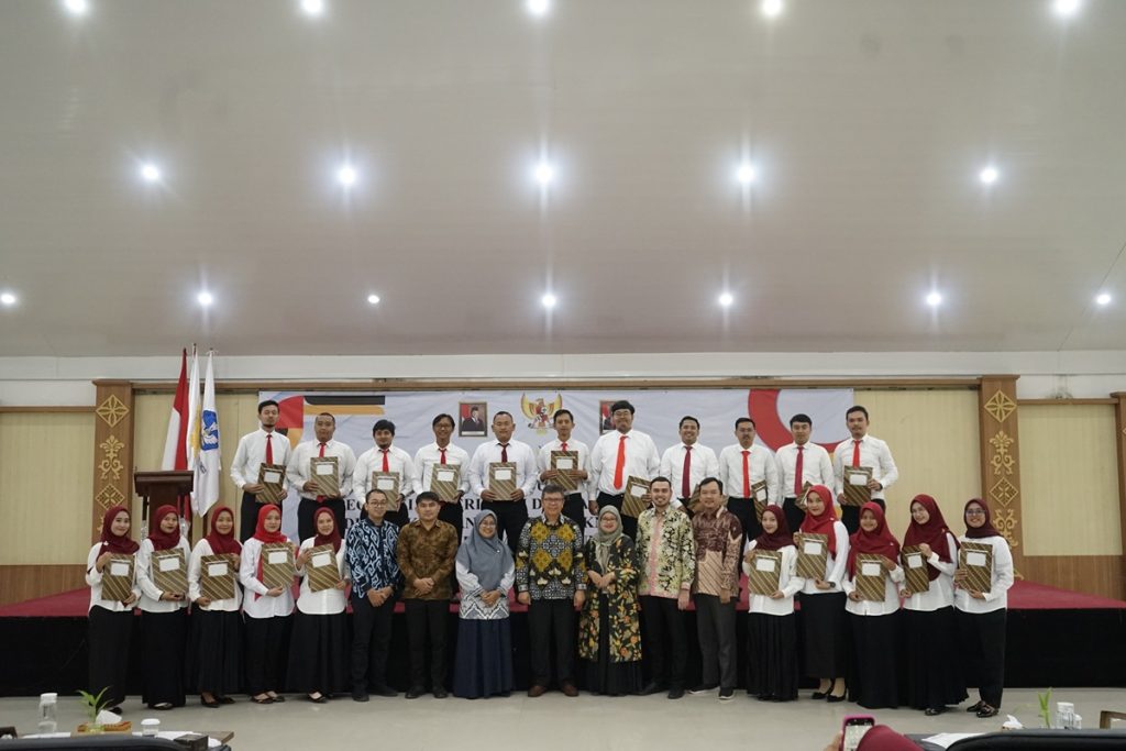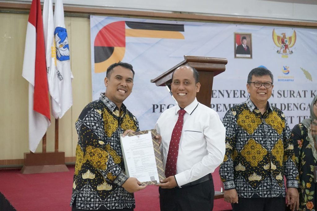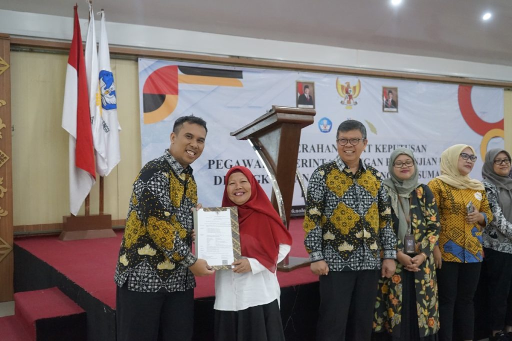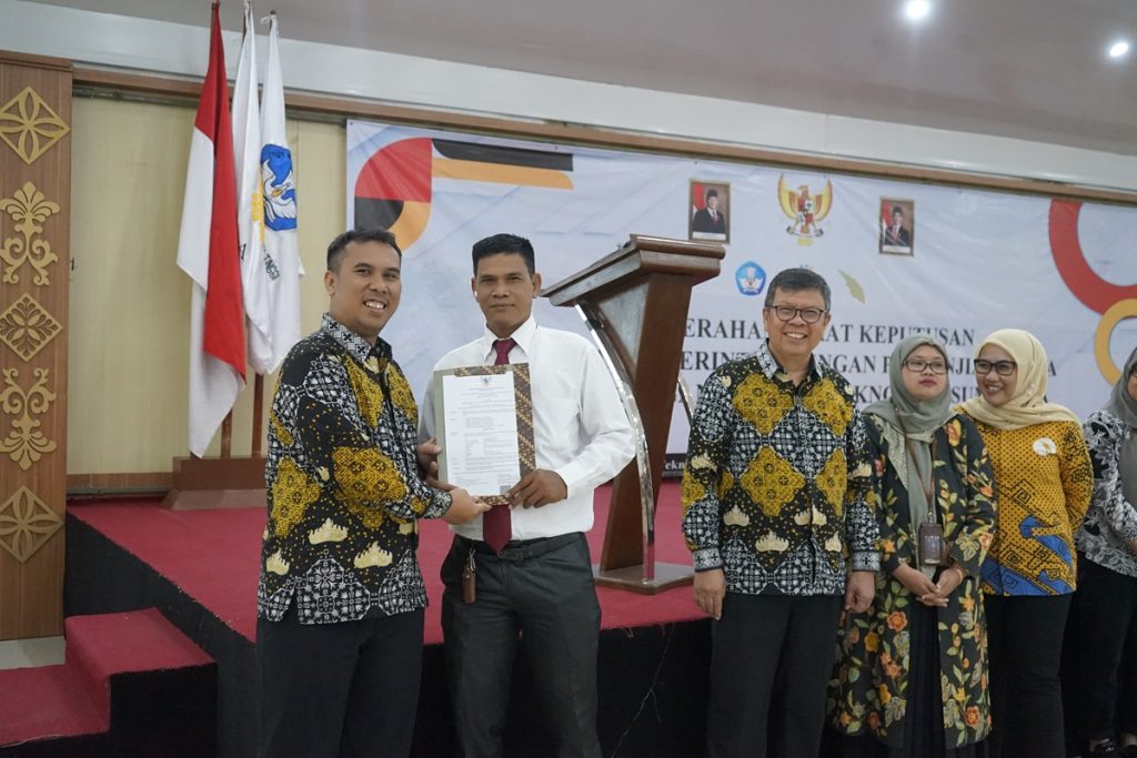Penyerahan SK dilakukan oleh Wakil Rektor Bidang Keuangan dan Umum, Ir. Arif Rohman, S.T., M.T., didampingi Wakil Rektor Bidang Akademik dan Kemahasiswaan, Prof. Dr. Eng. Khairurrijal, M.Si., Ketua Senat Itera, Dr. Sunarsih, M.A., serta jajaran pimpinan lainnya.