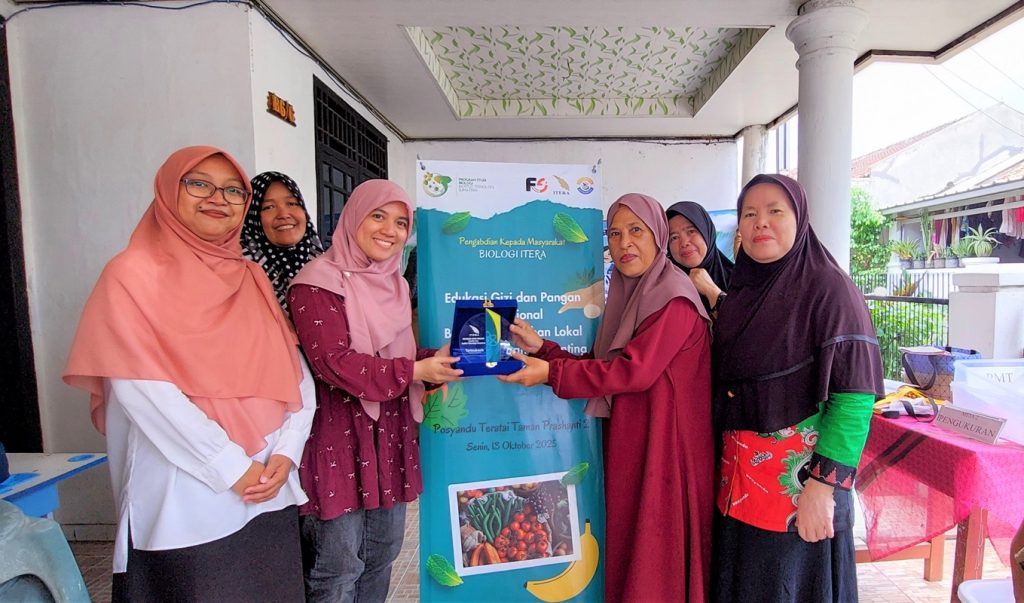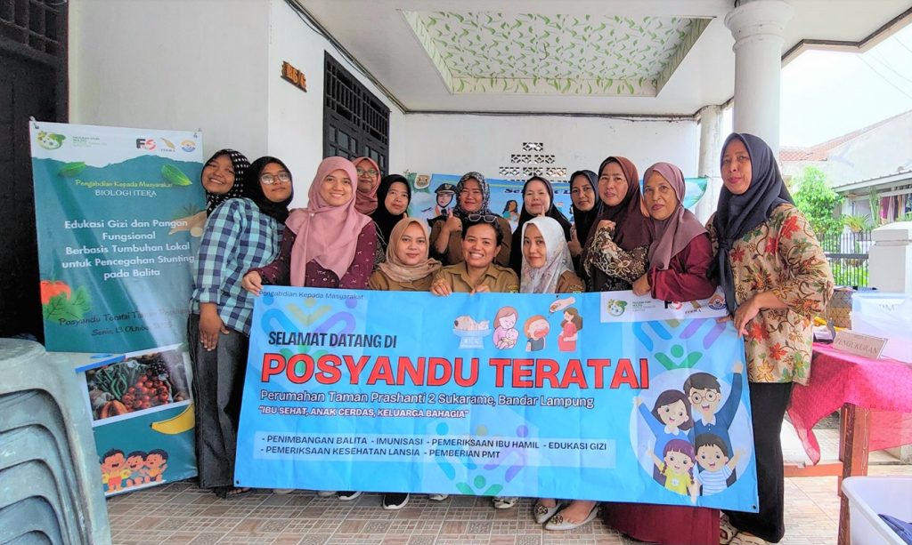 ITERA NEWS – Tim Pengabdian kepada Masyarakat (PkM) dari Program Studi Biologi, Institut Teknologi Sumatera (Itera) sukses menggelar kegiatan edukasi gizi dan pemanfaatan pangan fungsional berbasis tumbuhan lokal. Kegiatan ini berfokus pada upaya pencegahan stunting pada balita dan dilaksanakan di Posyandu Teratai Taman Prashanti 2, Kelurahan Sukarame, Bandar Lampung, pada Senin, 13 Oktober 2025.  Kegiatan ini dilaksanakan oleh tim dosen Biologi Itera yang terdiri dari Indah Oktaviani, S.Si., M.Si., Okta Yulia Sari, S.Hut., M.Si., Fajar Islam Sitanggang, S.Si., M.Si., dan Dr. Muhammad Asril.