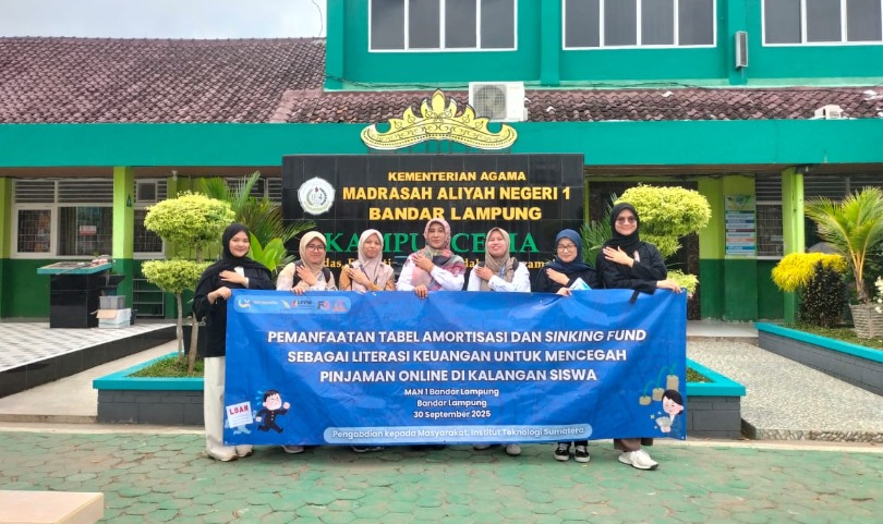 ITERA NEWS – Program Studi (Prodi) Sains Aktuaria, Fakultas Sains, Institut Teknologi Sumatera (Itera) melaksanakan kegiatan Pengabdian kepada Masyarakat (PkM) di MAN 1 Bandar Lampung, Senin, 30 September 2025. Kegiatan ini mengangkat tema “Pemanfaatan Tabel Amortisasi dan Sinking Fund sebagai Literasi Keuangan untuk Mencegah Jeratan Pinjaman Online di Kalangan Siswa. Kegiatan bertujuan untuk meningkatkan pemahaman siswa mengenai literasi keuangan agar lebih bijak dalam mengelola keuangan pribadi, khususnya di tengah maraknya tawaran pinjaman online (pinjol) yang berisiko menjerat generasi muda.